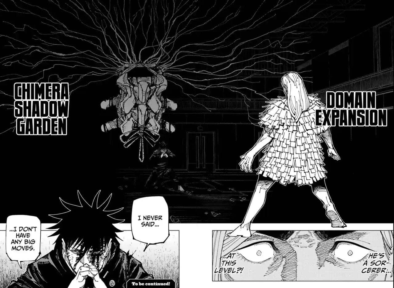 Como ele sempre achou técnicas de barreira difíceis até agora no Jujutsu Kaisen, Fushiguro decidiu renunciar ao requisito de barreira de um Domínio. Em vez disso, ele emboscou Reggie em um ginásio espaçoso, lançando Chimera Shadow Garden dentro dele. Em vez de criar fronteiras artificiais para seu domínio, ele permitiu que ocupasse todo o interior do ginásio, efetivamente tornando todo o edifício sua Expansão de Domínio.