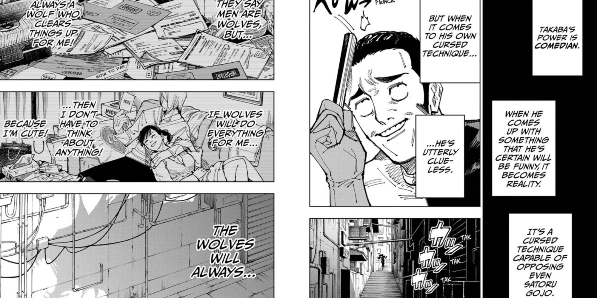 A técnica Ilimitado traz o conceito de “infinito” à realidade. Ele permite ao usuário manipular e distorcer o espaço à vontade. A Técnica Amaldiçoada de Takaba, apropriadamente chamada de ‘Comediante’, também tem a ver com a manipulação da realidade, mas em uma escala muito maior. Quando ele vem com algo que ele tem certeza que vai ser engraçado, isso se torna realidade. Em outras palavras, ele aparentemente pode fazer qualquer coisa ridícula que ele acha que seria uma boa piada em realidade.